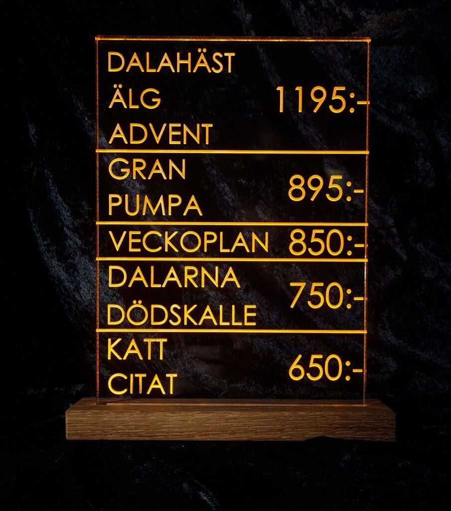 Inspireras av våra ljusskyltar. Här finns LED-skyltar i form av företagslogotyper, citat, djur, dalahästar och mycket annat. Bläddra igenom och hitta din favorit, att ställa i ditt hem eller att ge bort som gåva. Kom ihåg att du kan specialbeställa skyltar med motiv efter eget önskemål. Ta kontakt här.